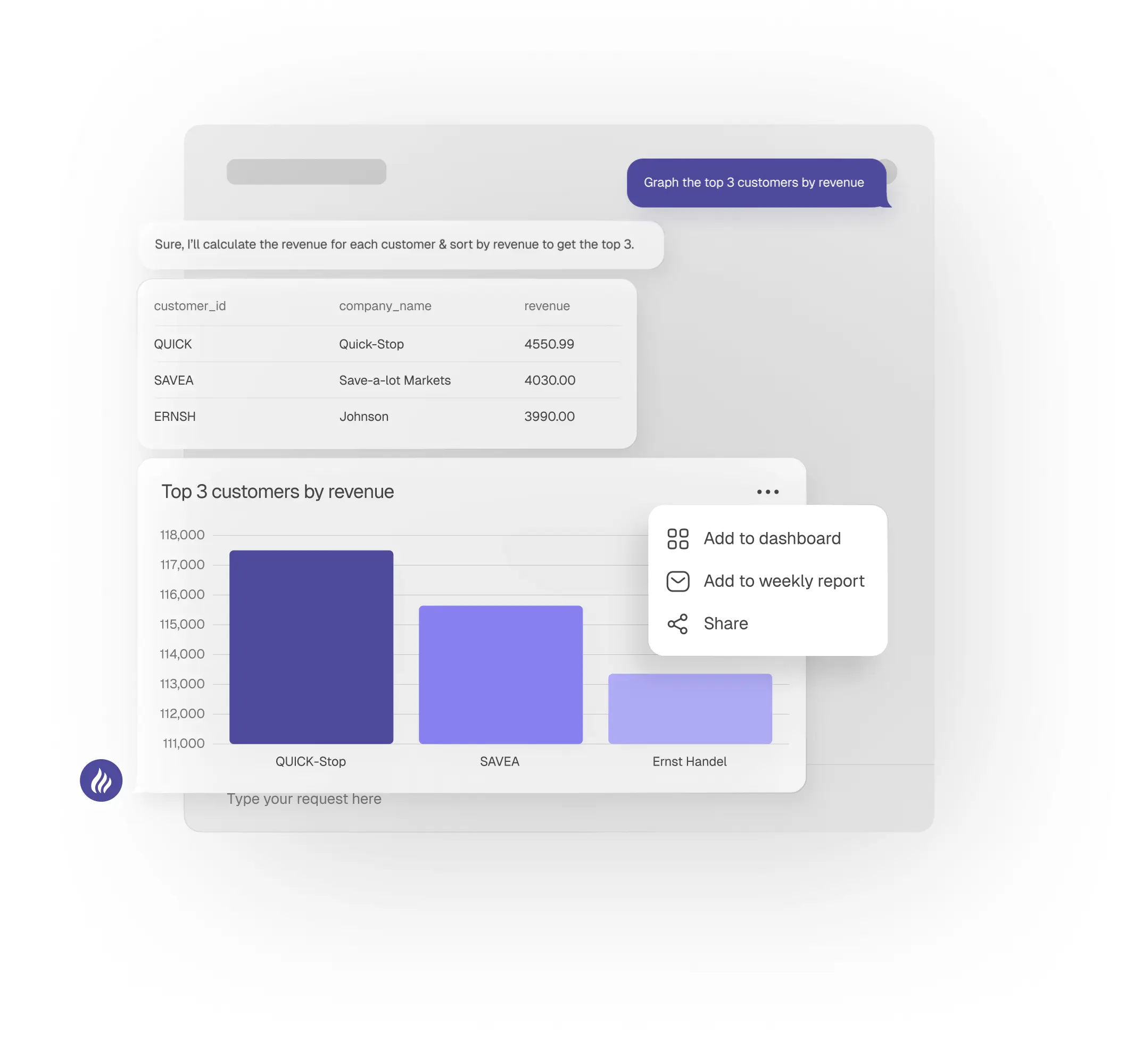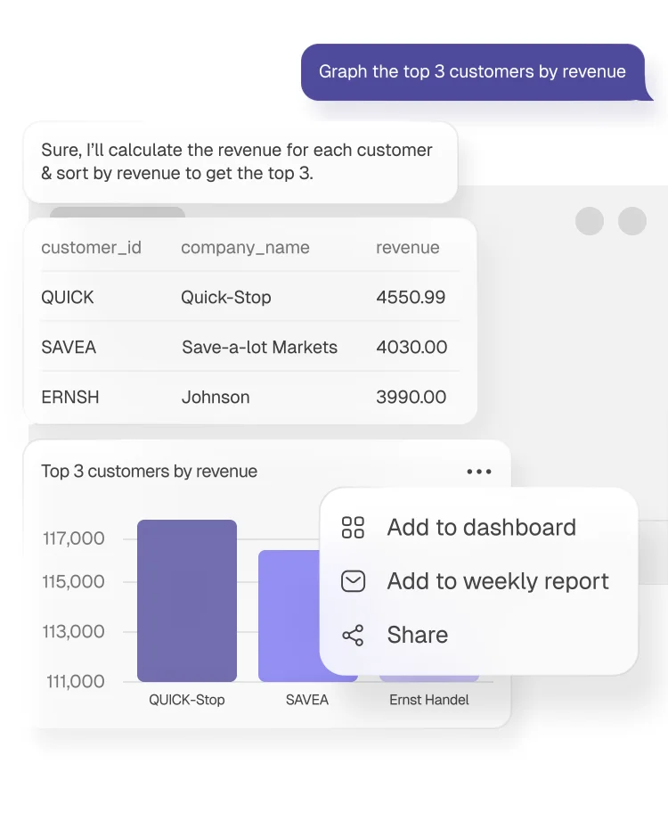 Our AI chatbot makes it effortless for anyone to get important insights from your database. This makes your teams faster & more informed.